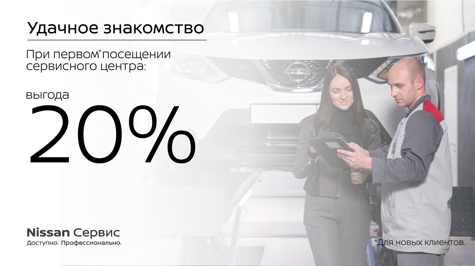 Автоцентр "АКОС-ЧЕЛНЫ" рад новым встречам. Для новых клиентов, которые покупали автомобиль Nissan не в дилерском центре действуют специальные условия обслуживания на первый заезд в сервисный центр с выгодой в 20% на сервисные работы.